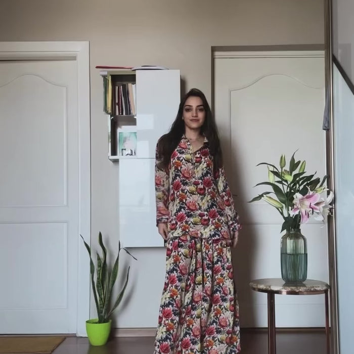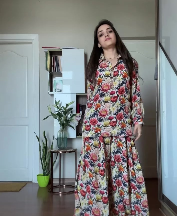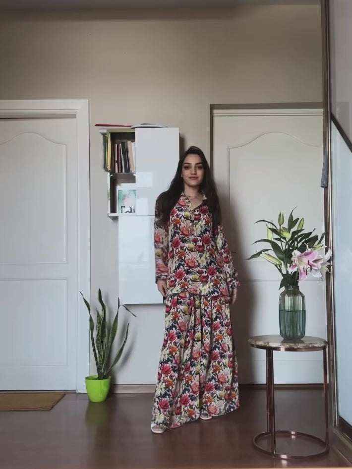 Multi-Colored Printed Modal Satin Co-ord Set with Trouser - S